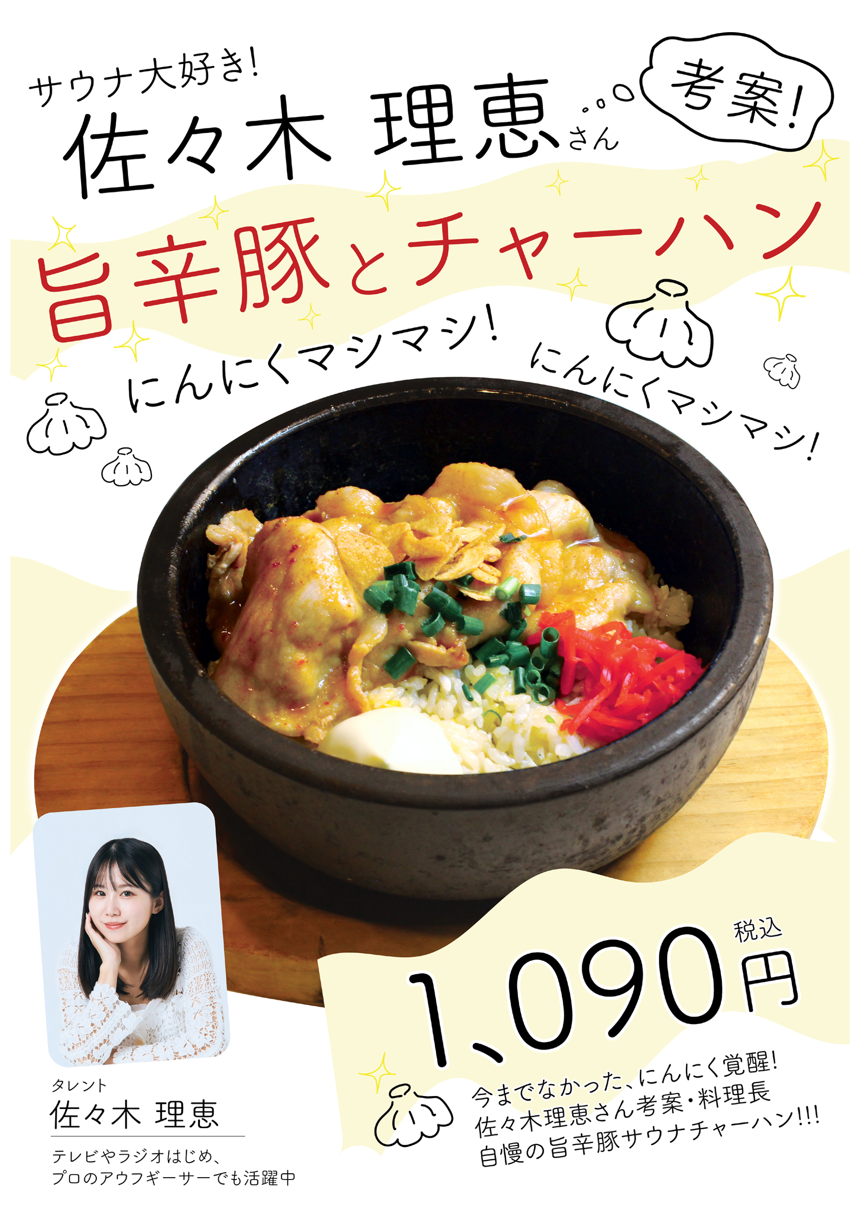Saunaタレントにしてプロアウフギーサーとして活躍中の佐々木理恵さんとのコラボにて生まれた新メニュー『旨辛豚とチャーハン』が期間限定で販売中。